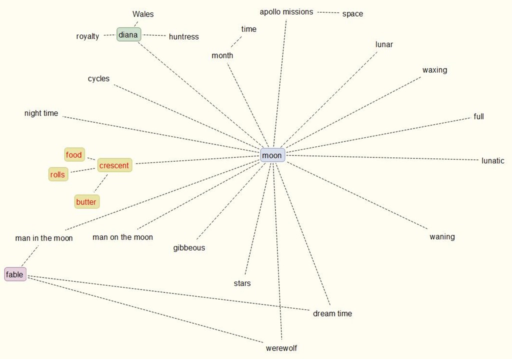 From the image you can see the process. That image is the result of doing a session based on the word Moon. Look at what you’ve drawn and try to find patterns you can work with. In this example, the name Diana might be a good topic to write on, there are directions you can take. Fables would be another good topic. You can go in several other directions from that word. The original word or phrase you started with may not even turn out to be the topic you end up with.